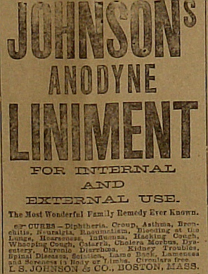 | Johnson's Anodyne Liniment cures nearly everything from asthma to lame back not to mention the more ominous bleeding from the lungs. |