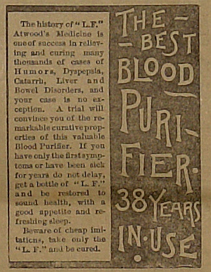 | Here is one of several blood purifiers. This one cures cases of humors, dyspepsia, catarrh, liver and bowel disorders. Other products touted even longer lists of ailments cured. | |