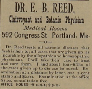| Dr. Reed took on patients regular doctors had sent away and cured 80% of them. Being clairvoyant came in handy; if you couldn't make it to the office you could just send in $2 and he'd cure you from a distance. | |
