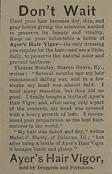 | The market for baldness "cure" is apparently nothing new. Ayers had a product for that also. | |