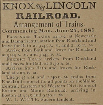 | Here is a listing of the train schedules for the just up and running Knox and Lincoln Railroad | |