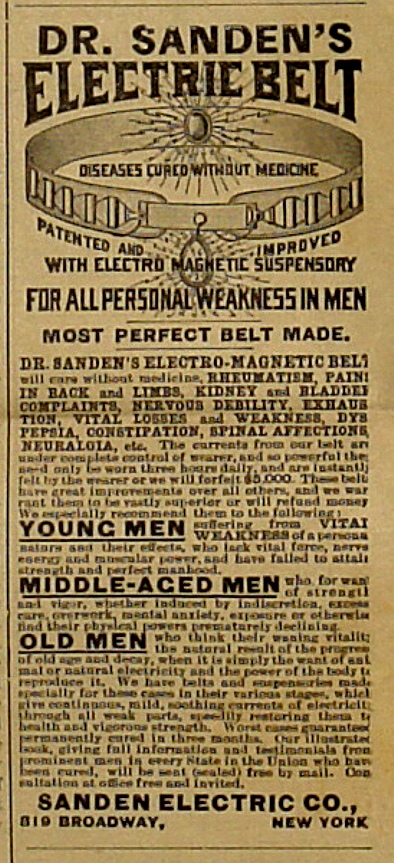 A postscript on the Sanden Electric Company's belt: Dr. Sanden's belt apparently was a big seller for many years. In 1914, some 25 years after this advertisement appeared the New York City Post Office took on the company and entered a fraud judgement against it and stopped mail service. In that hearing the postmaster reported Sanden was receiving 500 letters a day. Shortly thereafter, Sanden was charged with fraud in criminal court but was acquitted. Still need to know more about Dr. Sanden's amazing belt? Read on: