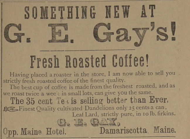 | G. E. Gay's had just installed a new coffee roaster and roasted twice a week. (Also note the dandelions for 25 cents a can.) | |