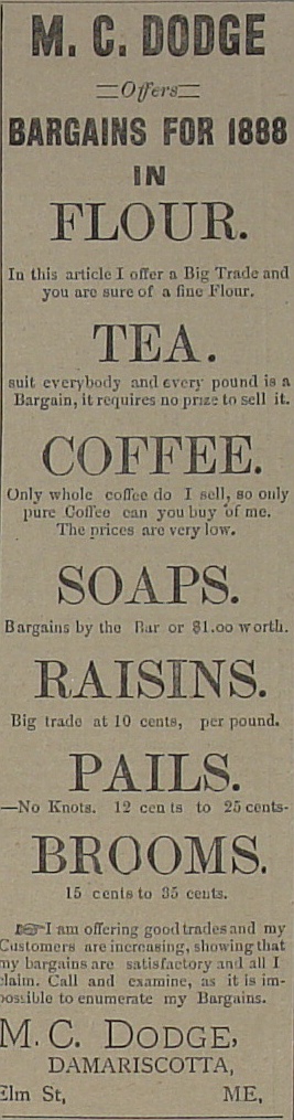 | Interested in 1889 prices for raisins, pails and brooms? Check this ad from M. C. Dodge. |