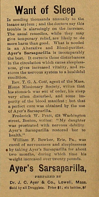 | Ayer's Sarsaparilla boldly claims that it will keep you out of the insane asylum! |